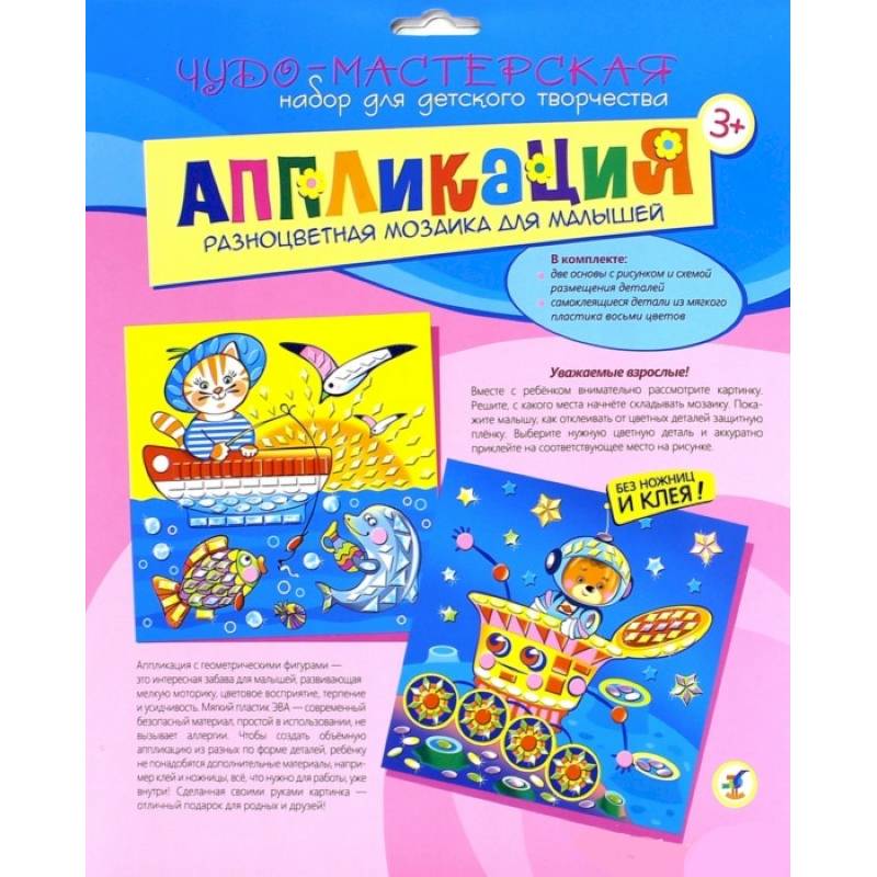 В комплекте: две основы с рисунком и схемой размещения деталей, самоклеящиеся детали из мягкого пластика 8-ми цветов.