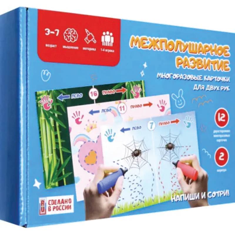 В наборе 12 двухсторонних карточек (24 картинки) и 2 маркера....