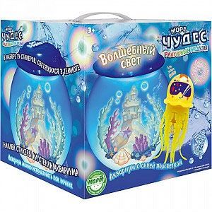 Аквариум с волшебной синей подсветкой (в крышку вмонтированы светодиодные лампочки) и радужная медуза, которая плавает, погружаясь на дно и поднимаясь к поверхности, светясь и переливаясь всеми цветами радуги. Специальные наклейки на аквариум тоже ярко светится в темноте. Благодаря подсветке, аквариум можно использовать как ночник.