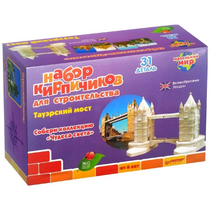 Соберите всю коллекцию конструкторов из кирпичиков 'Чудеса света'и воссоздайте памятники прошлых и современных цивилизаций. Для детей от 6 лет. Как играть: - Нанесите полученный раствор на кирпичики и плотно прижмите их друг к другу. - С помощью мастерка из набора и влажной тряпочки удалите лишний раствор с деталей конструктора. - Когда макет будет закончен, просушите его в течение 8 часов, после чего протрите чистой сухой тряпочкой. ЭКО Чистый продукт. Как разобрать макет и построить его заново: - Опустите конструкцию в емкость с водой и оставьте там на 30 - 60 минут, пока не растворится цемент. - Промойте кирпичики. - Высушенный в лотке цемент можно использовать повторно. - Теперь вы можете начать строить заново! Как получить цементный раствор: Небольшими порциями, медленно помешивая, добавьте цементный порошок в воду (4 части цемента на 1 часть воды). Полученную массу продолжайте помешивать, пока она не станет однородной. Обратите внимание: если раствор получится слишком жидким, добавьте еще цементного порошка.