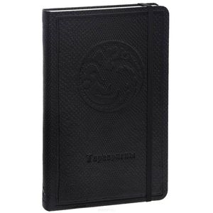 Обложка изготовлена из термоматериала, имитирующего кожу, с тиснением. Блокнот скреплен резинкой аля 'молескин'. Внутри линованный блок на высококачественной бумаге.